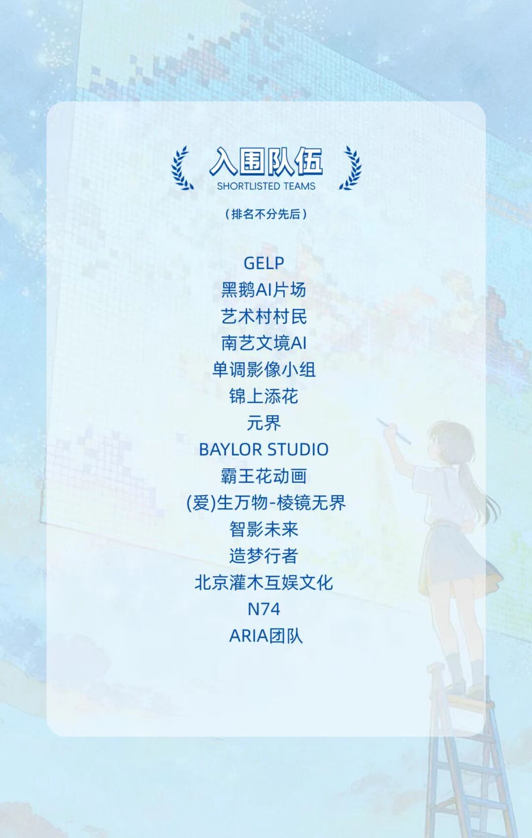 经过赛事评审团多轮严谨的审片研讨、深入的技术适配性评估以及全面的综合维度评定,从创意完整性、AI应用创新性到文化表达力等多个层面进行层层筛选与把关,最终15支卓越团队脱颖而出,成功入围。这些团队以其独特的创意视角、精湛的技术运用和深厚的文化理解,充分展现了AIGC技术在动画创作中的无限可能与独特价值。